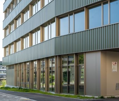 Geilinger erstellt die Pfosten-Riegelfassade im Erdgeschoss mit den zwei repräsentativen Zugängen, Metalltüren und die Faltschiebetore für die Gewerbeflächen.