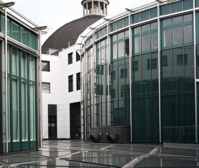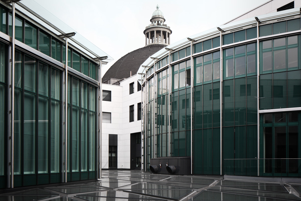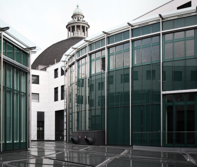 Die Fassaden der Innenhöfe und das Glasdach mussten ersetzt werden. Die neue Fassade präsentiert sich als Hofumfassung mit einer hinterlüfteten Natursteinfassade. In diese Fassaden sind unsere Connex Cube Holz-Metallfenster in einer Sonderlösung mit SSG verklebten Gläsern integriert.